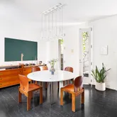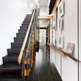 Neatly tucked on a quiet row, enter the home through either the front door or directly through your private garage. Inside, grand double-height ceilings and a stunning oak and steel staircase greet you. A large open kitchen has been custom designed with soapstone countertops, open shelving, chef’s appliances and a spacious dining room that opens to a private patio. Access to a half bathroom and guest accommodations can also be found on the ground level.