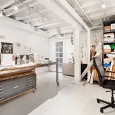 On the cellar level, an expansive flexible-use living space is currently being used as a home office and gym. The space features high ceilings, poured concrete floors, a small outdoor area, and ample storage space. Laundry facilities are also located on this level.