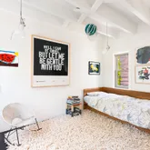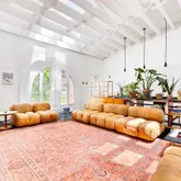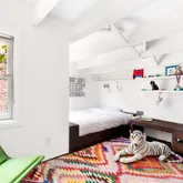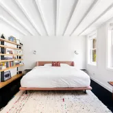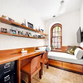 Upstairs, a former hayloft has been tastefully converted into a living room with high ceilings, exposed beams, oversized arched windows, whitewashed exposed brick, and incredible light. The large master bedroom suite with a custom closet, wall of bookshelves, and windowed bath is also on this level. On the top floor, find two additional bedrooms and a second full bathroom. In consistency with the rest of the home, each bathroom represents a careful combination of simplicity and craft, with rustic Terracotta tiles in subtle colors complemented by concrete and limestone details.