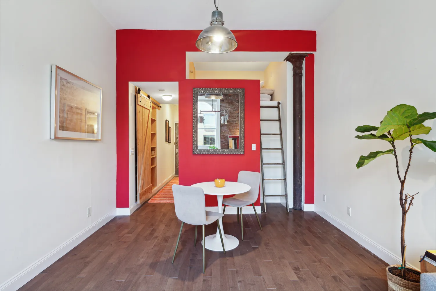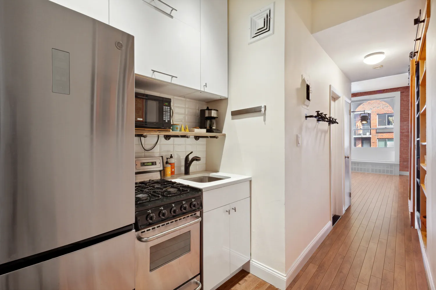 This charming, turnkey apartment features a kitchen, bathroom, and hardwood floors that have all been updated along with exposed brick, an industrial column, a rare arched window and a large sleeping loft. The home provides plenty of room for living, dining as well as work spaces and its super efficient layout is amplified by the soaring ceilings. There is built-in storage with a sliding barn door and not an inch of wasted space throughout.