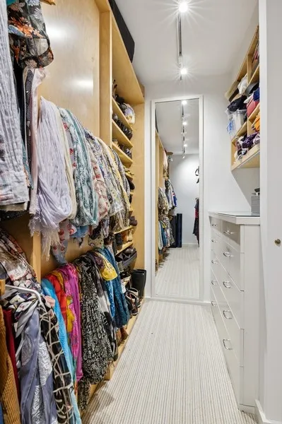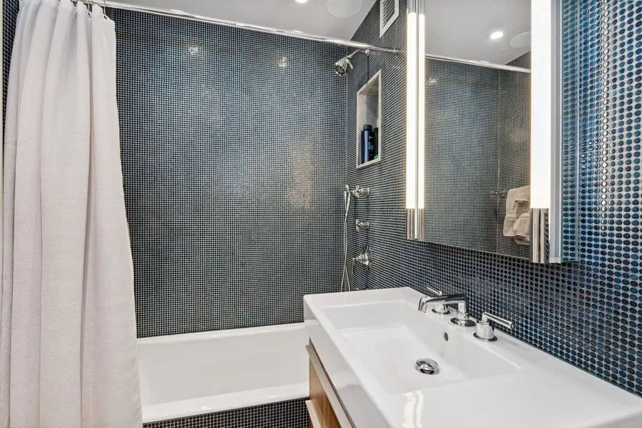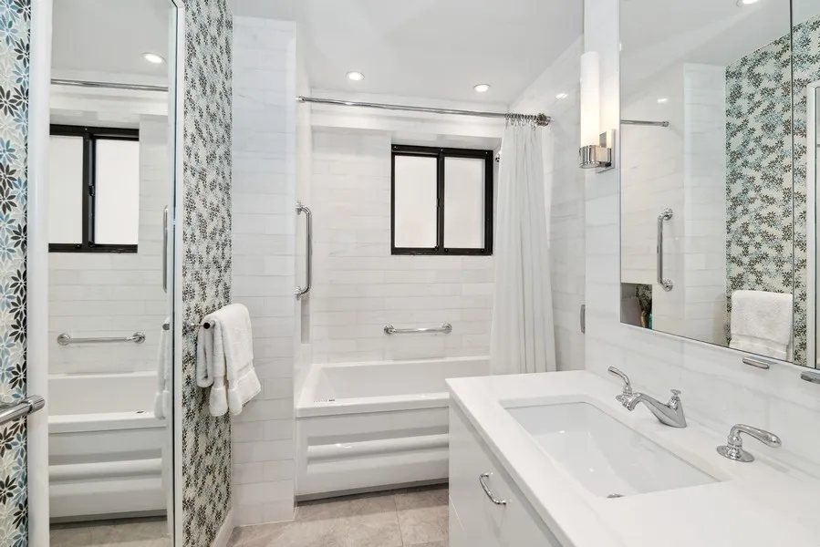 The first additional bedroom has a northern exposure, two custom closets with door-activated lighting, wood blinds, and a windowed ensuite bathroom lined in charming mini-penny tile, with a generous Duravit vanity, lighted Robern medicine cabinet, Toto toilet, Kohler tub with Waterworks fixtures, and heated terrazzo floor tile.