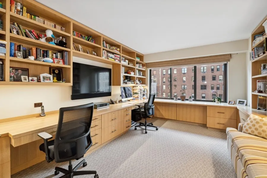 A fourth bedroom is currently set up as a home office with extensive custom cerused-oak cabinetry, undercabinet lighting, lockable filing drawers, twin desks, and a plentiful supply closet with door-activated lighting, all with a sunny, open Park Avenue view. Opposite the home office is a powder room with a Waterworks hammered-metal sink and fixtures, Toto toilet, and marble counter and floor.