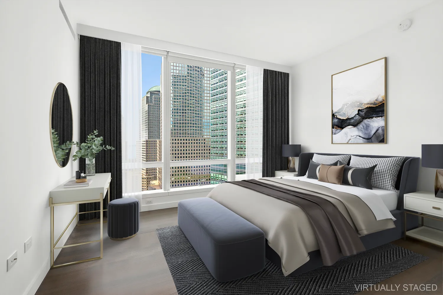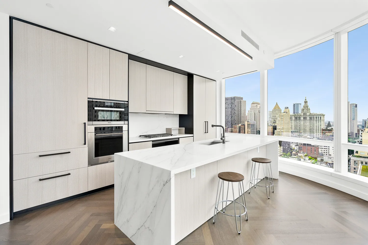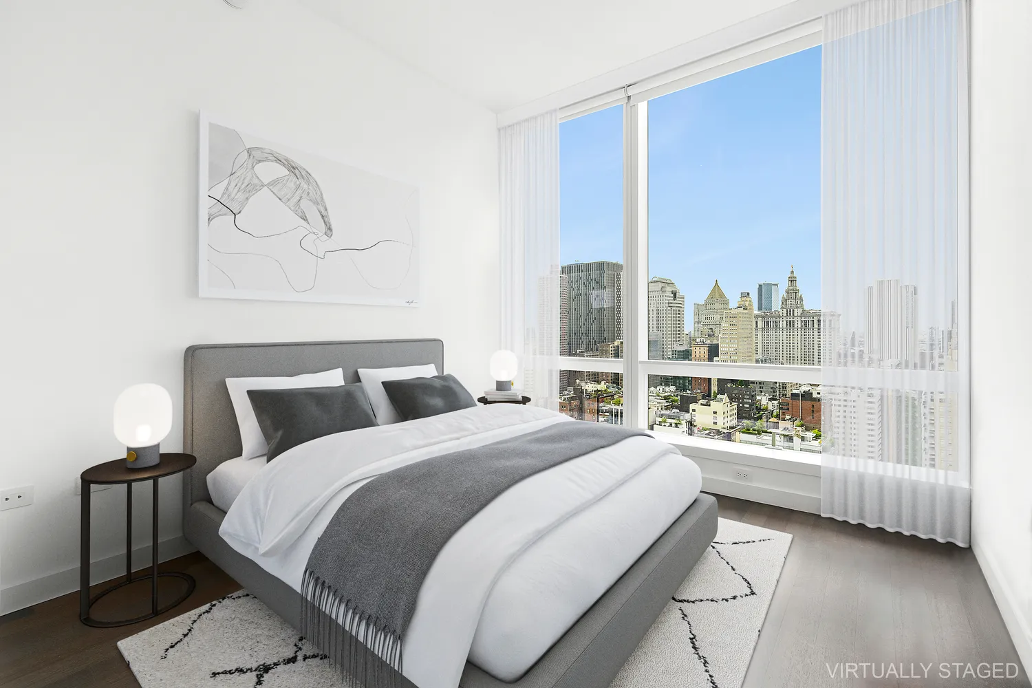 The generously proportioned master bedroom offers two large walk-in California Closets and a massive window allowing beautiful natural light in. The master bathroom includes radiant heat floors, travertine stone slab feature wall, double vanities with custom white marble and Dornbracht fixtures. The free standing BluStone soaking tub is the star of the show providing a perfect interlude to end your day. A spacious guest bedroom includes an ensuite bath with powder room and lovely fixtures to complete this magnificent space. No detail was left untouched in this exquisite residence located in the notable, 111 Murray. Residents will have access to all 20,000 square feet of the building’s luxurious indoor and outdoor amenities.