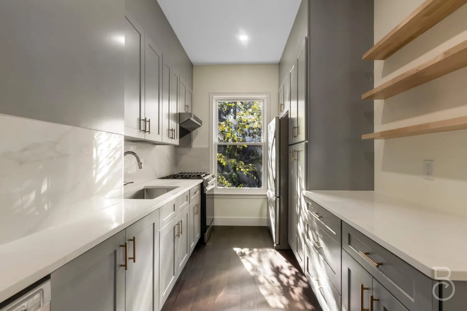 Entertaining will be a breeze in the brand new kitchen with custom cabinets and a full wall pantry. Meal prep on the white quartz countertops and 30” stainless steel sink with Moen sprayer faucet. This windowed kitchen is fully equipped – stainless steel appliances, hands free above range vent, dishwasher, and full butcher block floating shelves as and added decor.