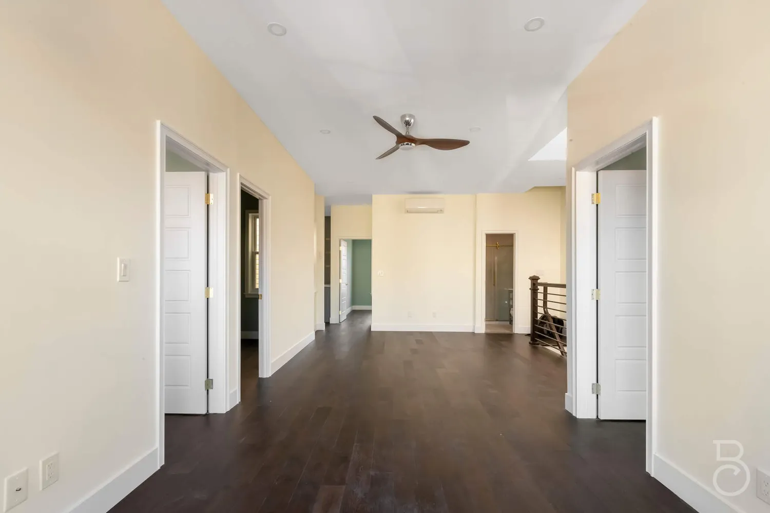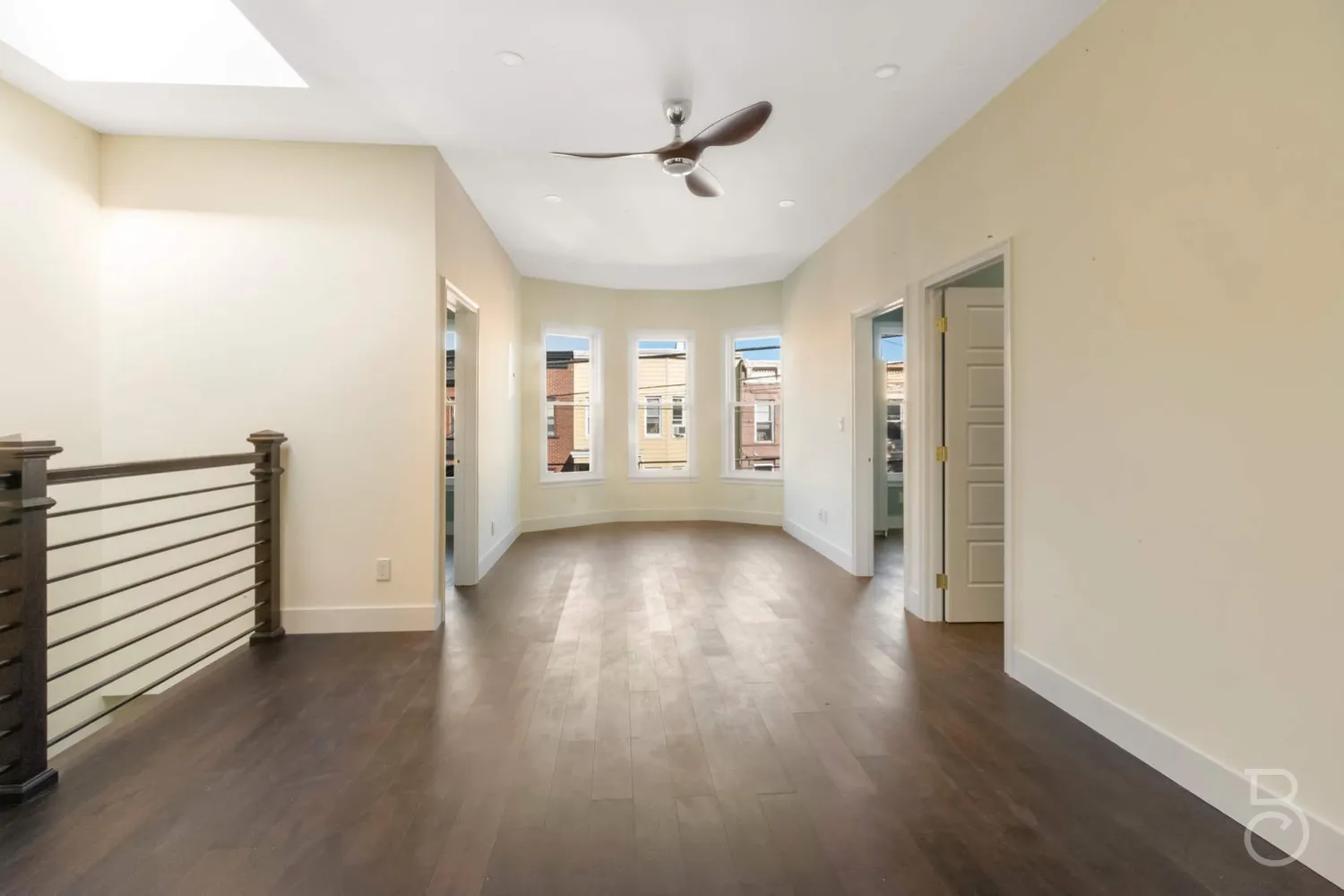 Brand new oak stairs lead to an amazing sun-drenched landing (courtesy of the skylight) where the 200+ sf living room is visible through the beautiful wrought iron railings.