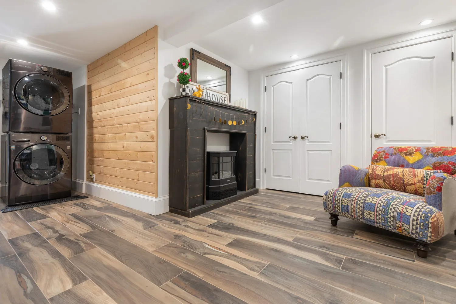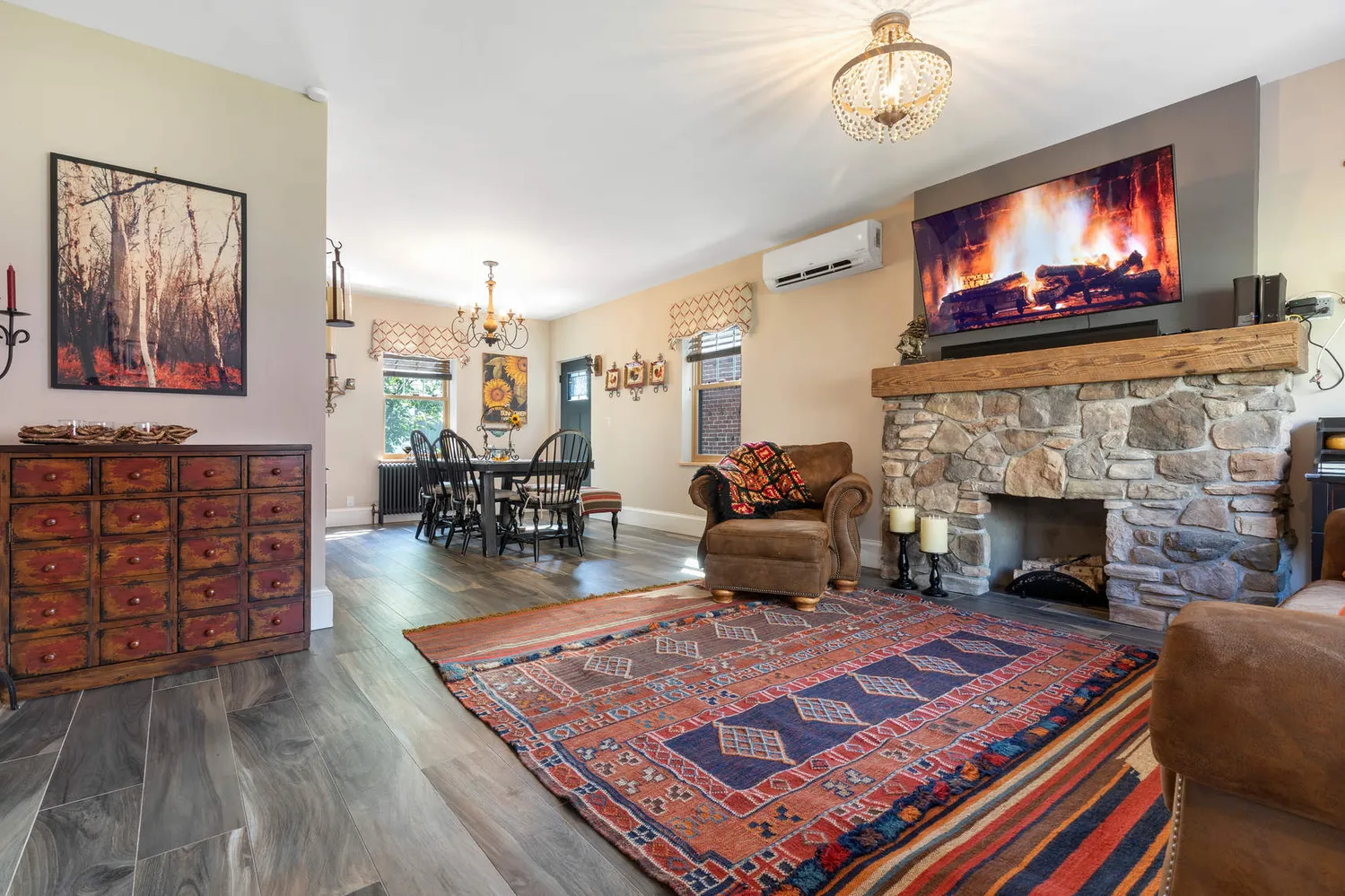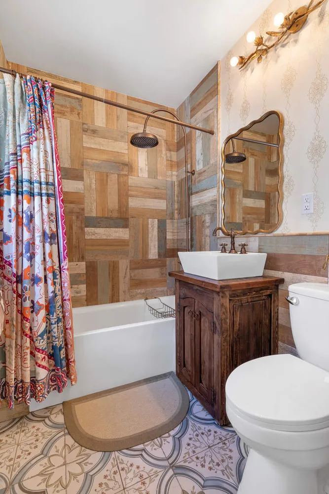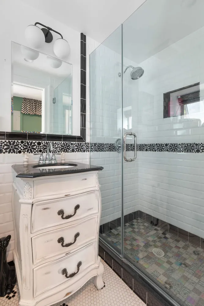 On the upper level, the king-size primary bedroom features custom closets and built-in shelving, while an adjacent bedroom has been transformed into the walk-in custom closet of your dreams. There is a second large bedroom on this floor, plus a remodeled full bathroom with a tub/rain shower, vessel sink, antique brass fixtures and charming tilework. On the top level, discover a spacious loft with 10-foot-tall vaulted ceilings, perfect as additional living, sleeping or home office space. In the finished basement, you will find another living area, storage, laundry and a new full bathroom with a frameless glass rain shower. LG split units on every floor ensure year-round comfort, while a private community driveway leads to your attached one-car garage and one additional parking space.