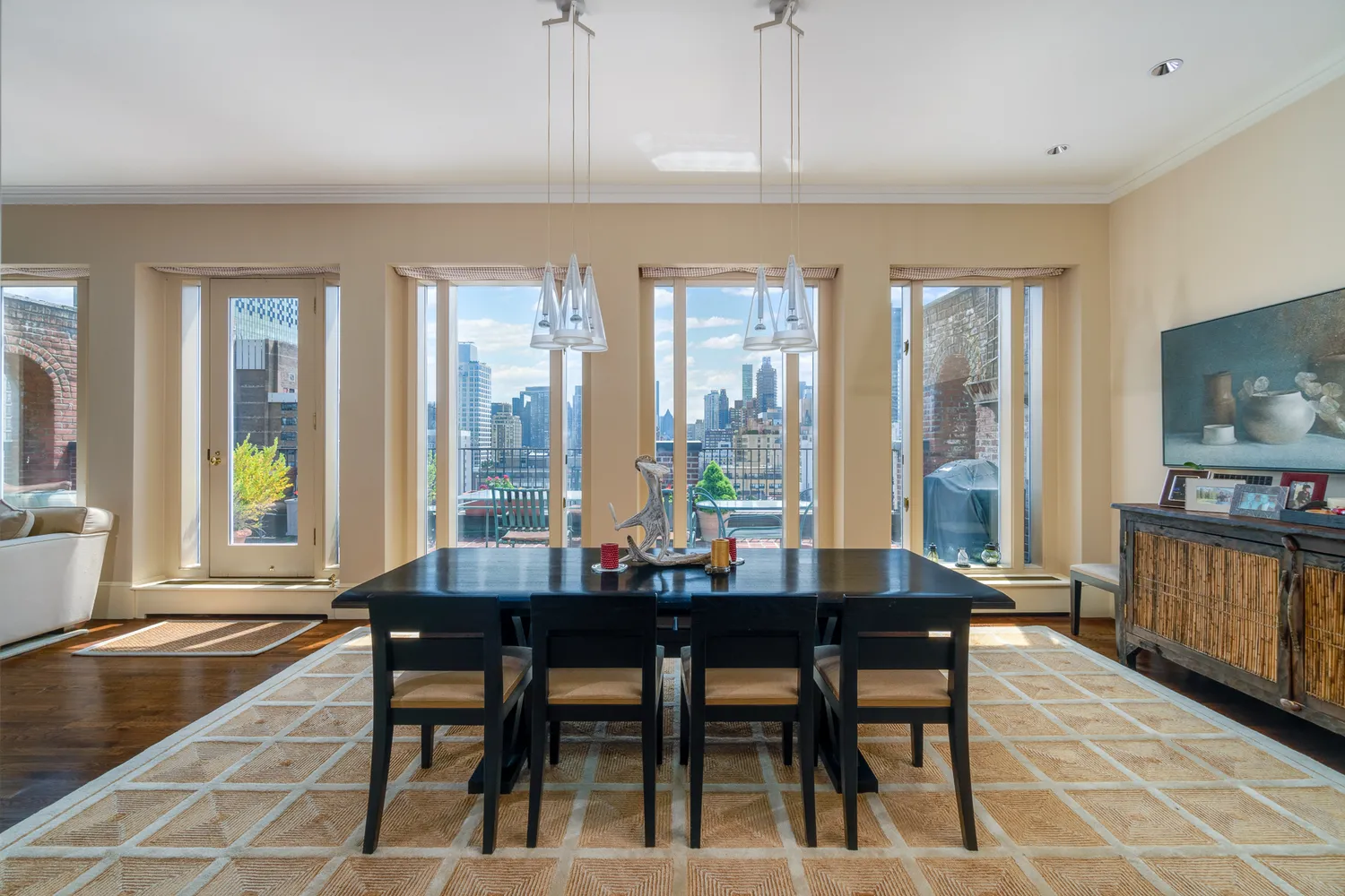 The elevator opens directly into an entrance gallery adjacent to a dramatic living room with woodburning fireplace, framed by a wall of south facing, floor to ceiling windows and access to the sweeping south terrace. The floor to ceiling windows continue across the dining room with both rooms offering wide open dazzling views of the Manhattan skyline and sunsets.