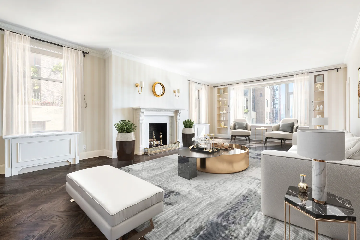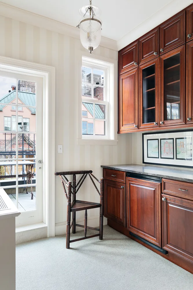 Ascending the stairs leads to a large landing with a dry bar that leads to an expansive wrap-around terrace, ideal for entertaining. The corner primary suite, with windowed ensuite bath, has a wall of storage and French doors leading to the terrace. The fourth bedroom and windowed hall bath are also found on this floor. There is also a second entrance to the apartment on this level offering the opportunity to access either floor directly from the elevator.