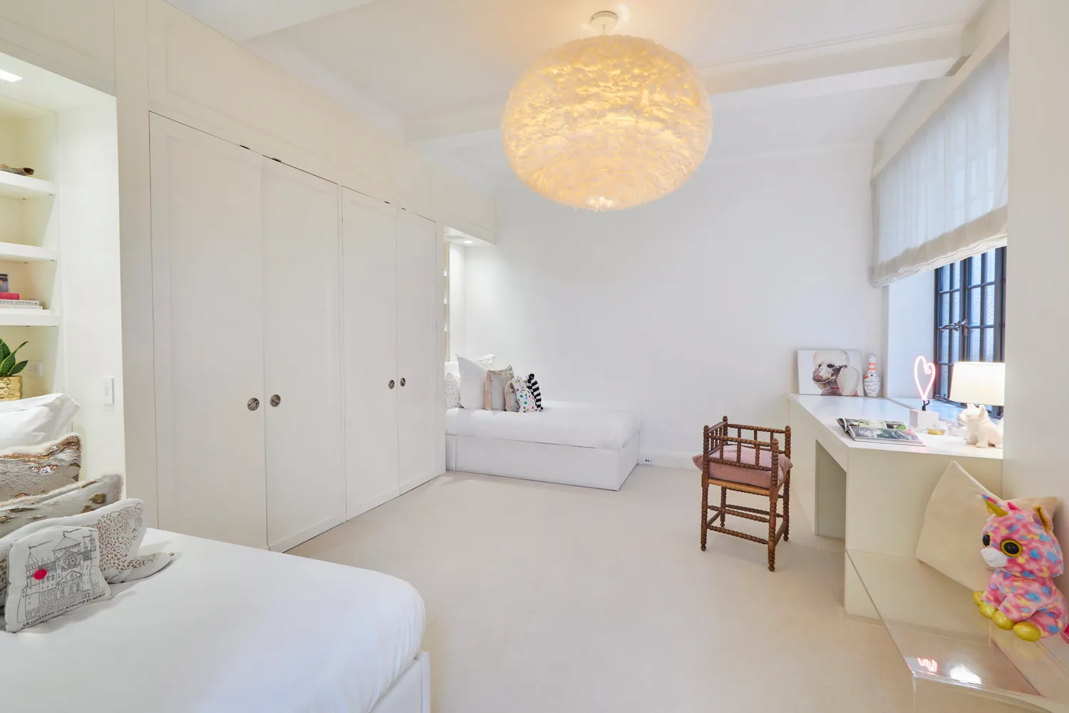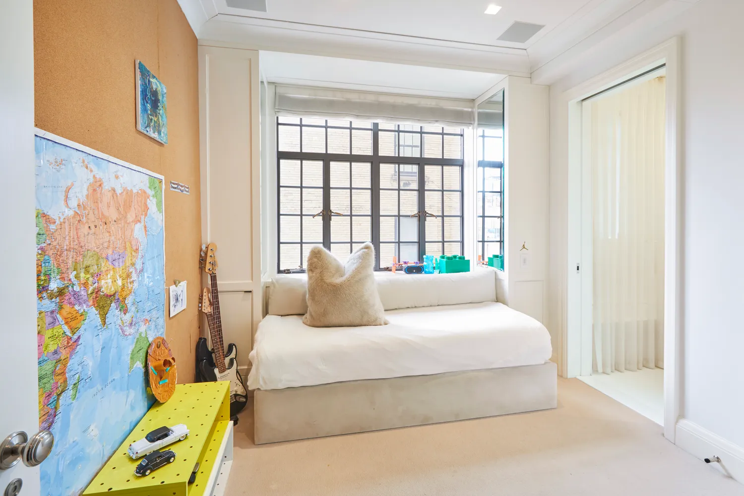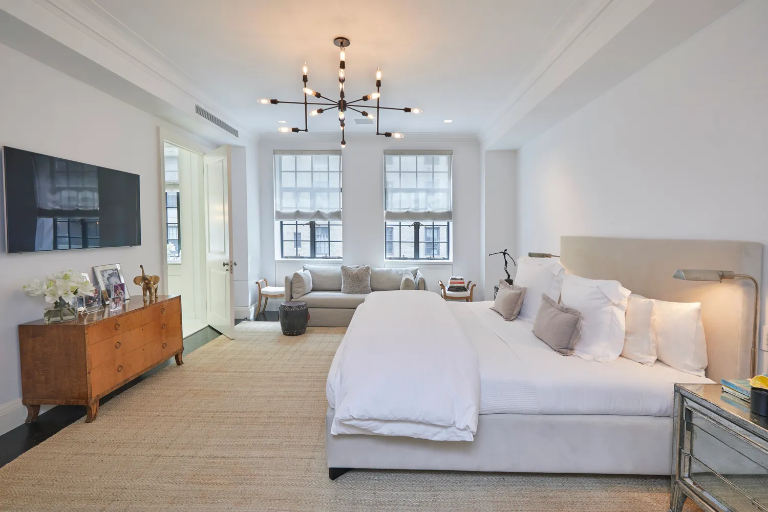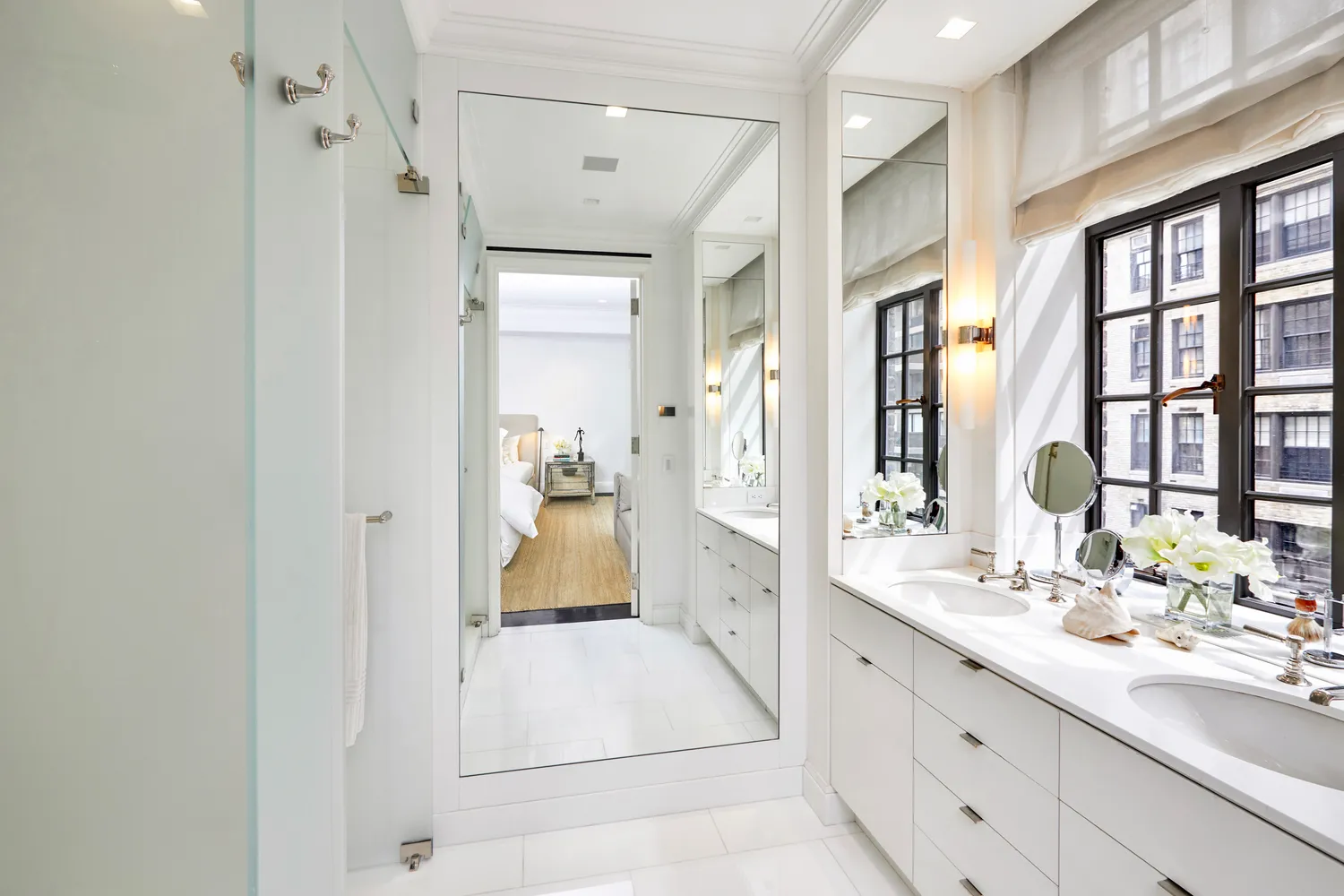 The south-facing, sun-filled Primary Bedroom suite includes two walk-in closets as well as an office and additional storage areas, a windowed, double-sink bathroom with a private water closet, radiant-heated floors and French Horus polished nickel fixtures.