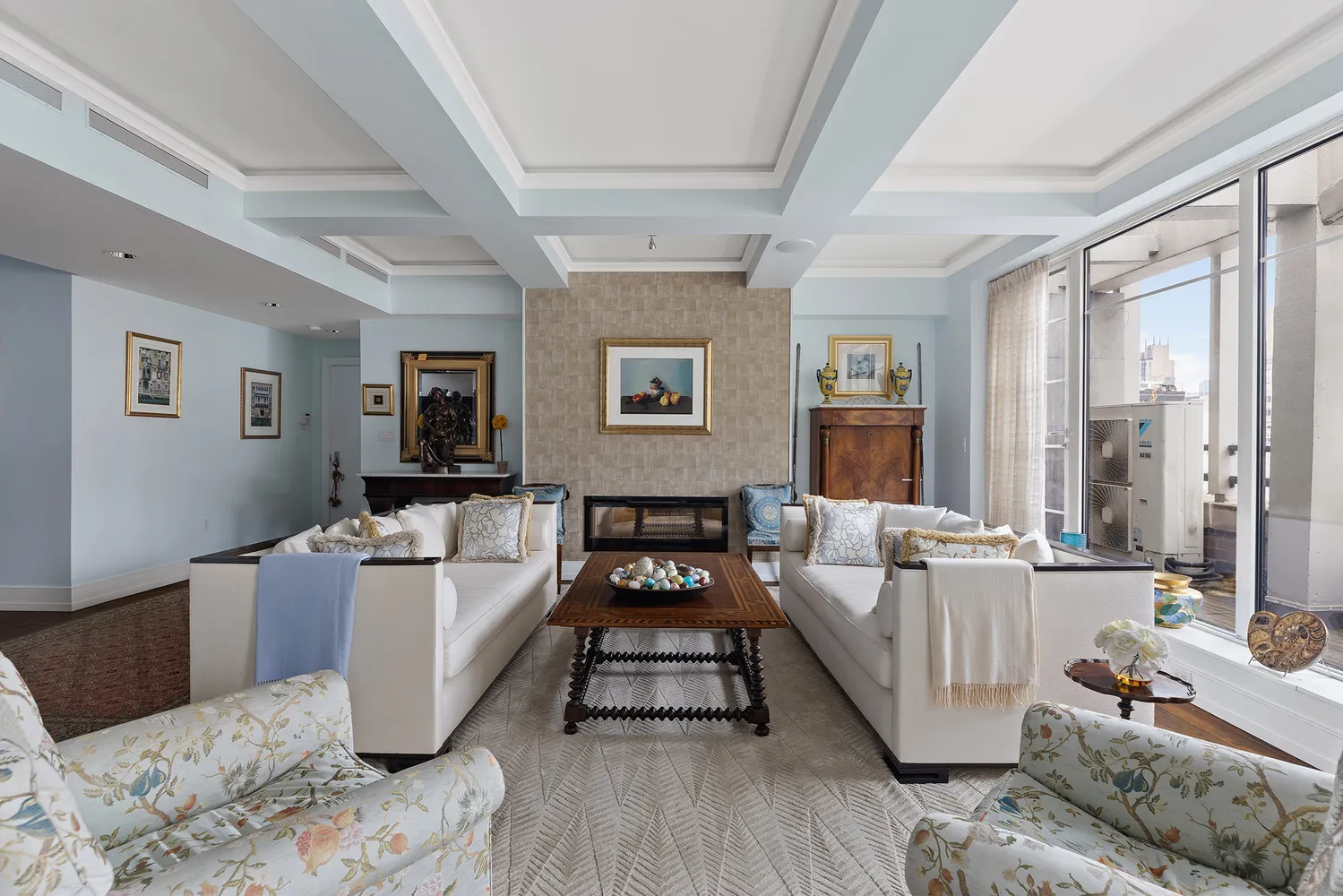 Other features of this tastefully appointed apartment include a multi-zoned, central air-conditioning system, recessed lighting, abundant closet space, a fireplace, solid reclaimed wood floors, and a sound system with built-in speakers.