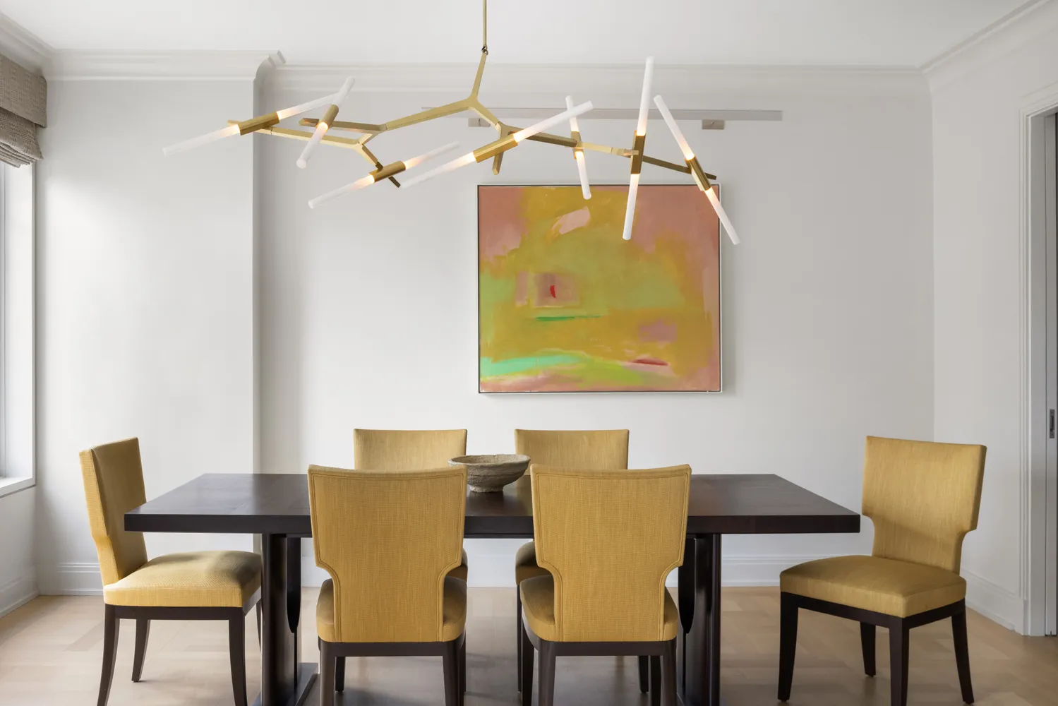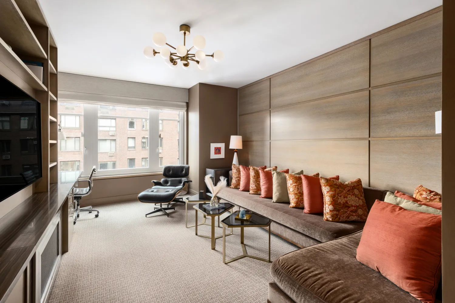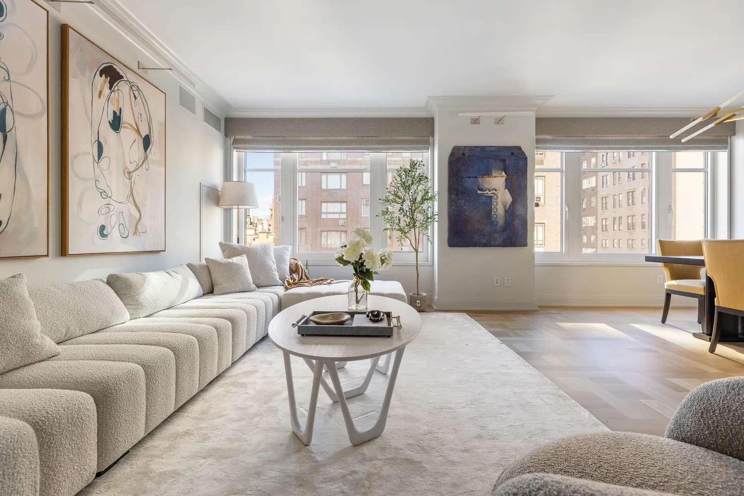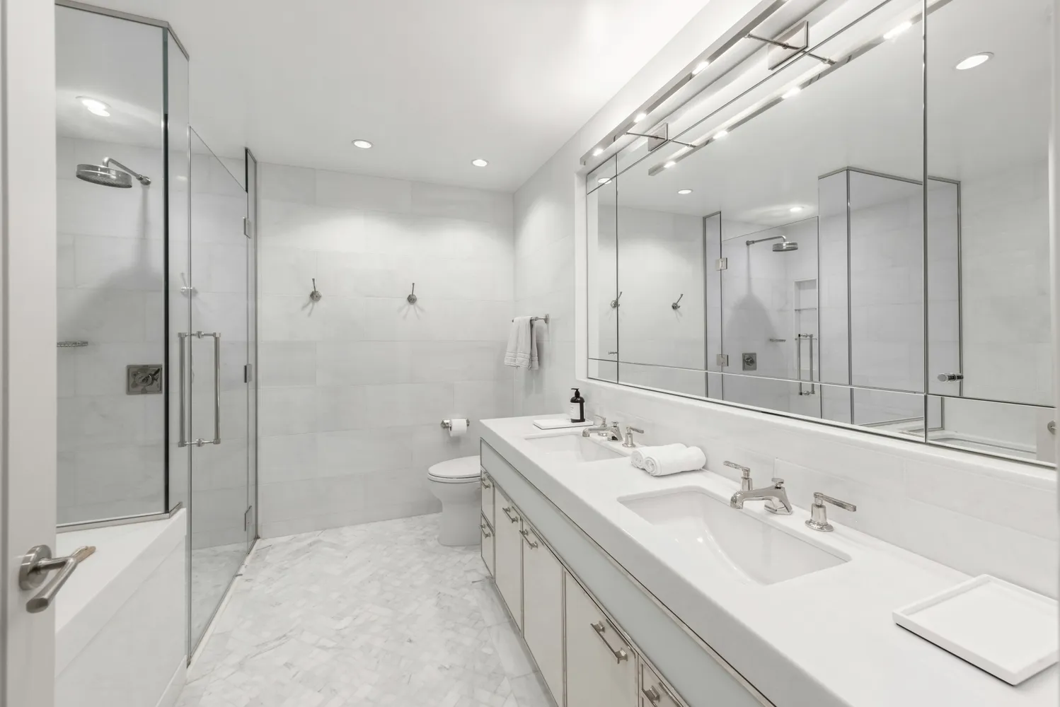 The apartment features four bedrooms, one configured as a den, each with private baths situated in a distinct wing. The generously proportioned primary bedroom comes with an exceptional array of fitted closets, including a walk-in, complemented by custom walnut cabinetry. Its en-suite bathroom has been redesigned with Calacatta gold marble, a double vanity, a Starfire glass-walled shower, soaking tub, and elegant Lefroy Brooks fixtures.