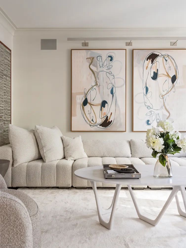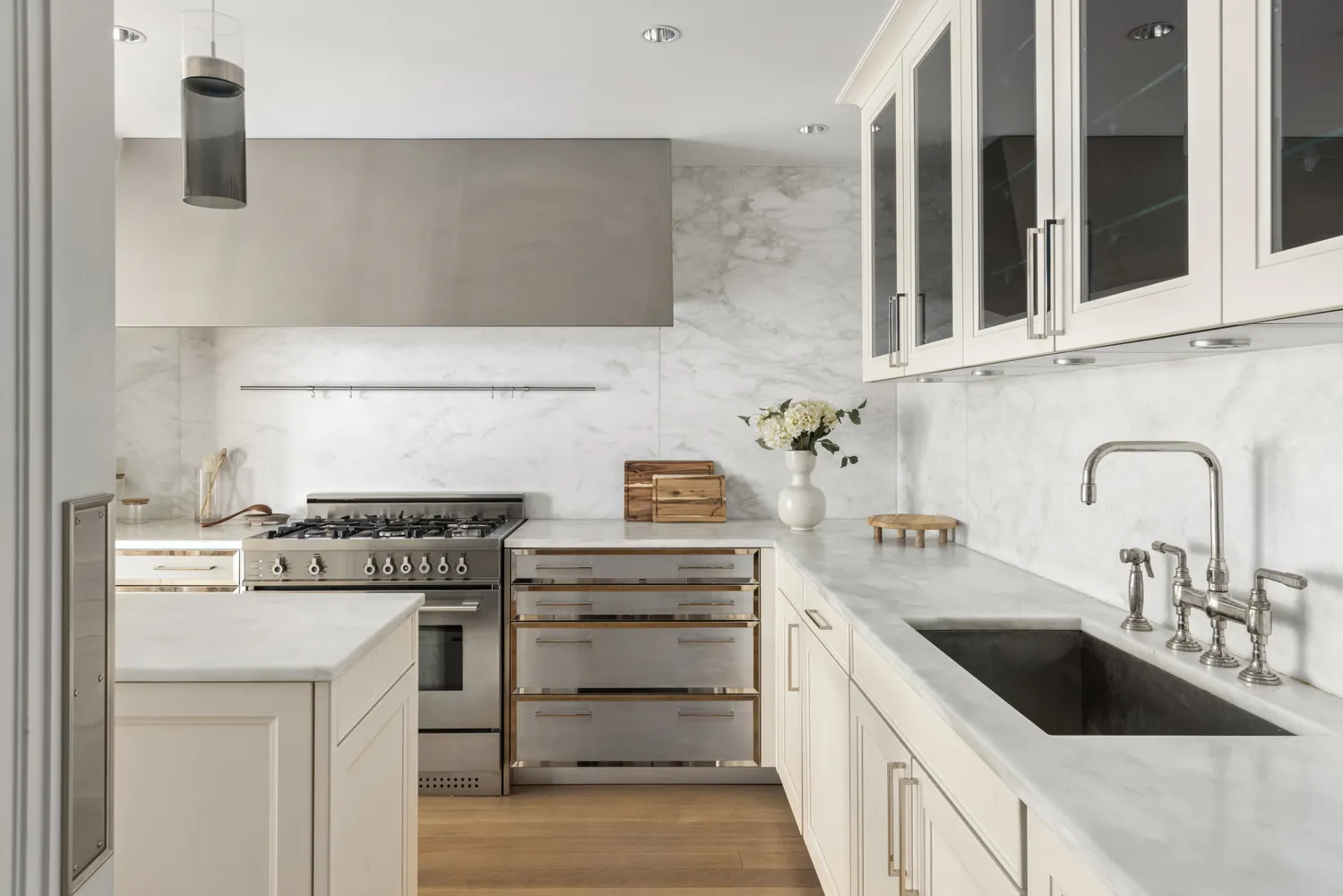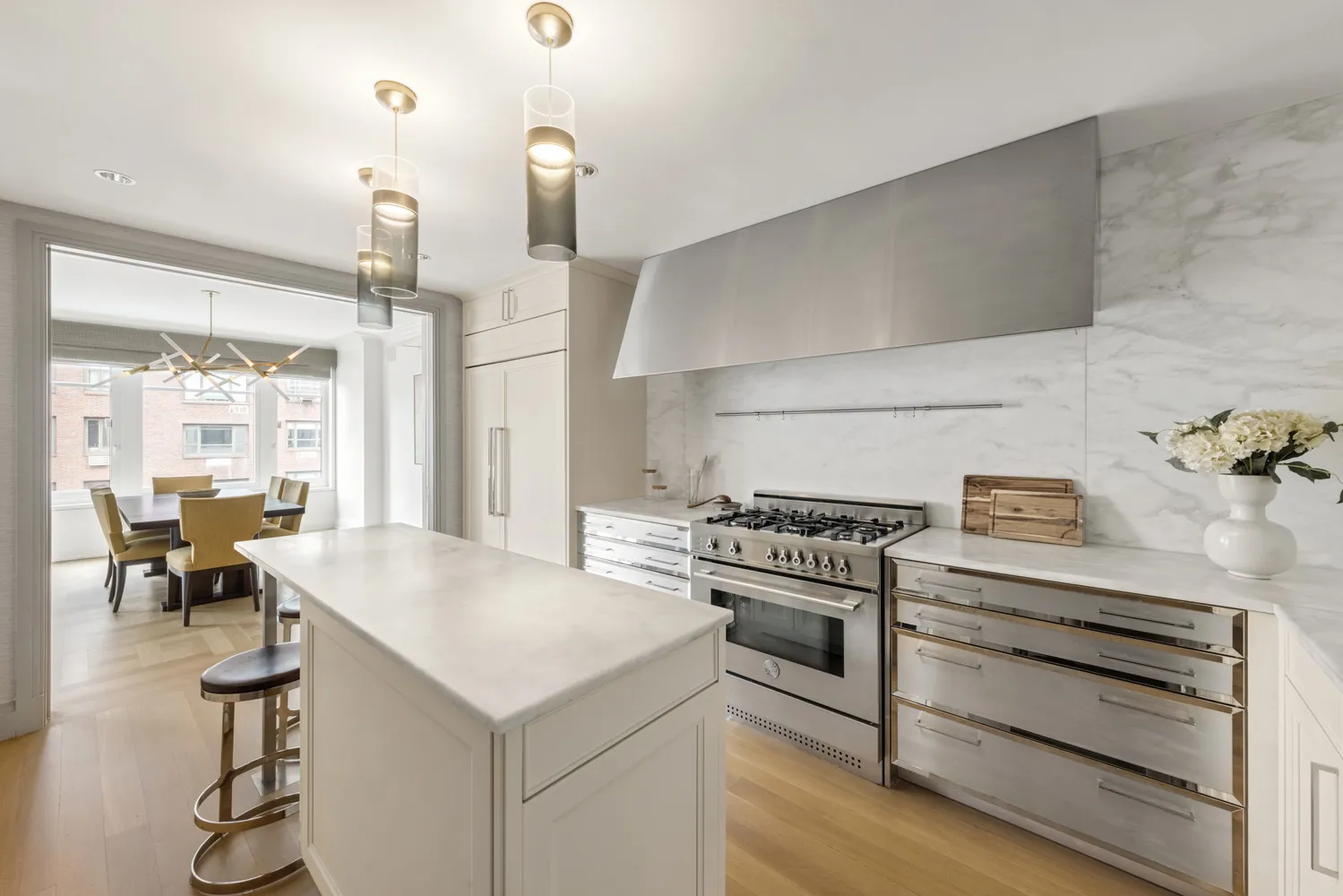 You're greeted by a grand gallery adorned with a walnut and antique mirror accent wall, leading into a luminous, expansive living room and dining room. These areas are designed for everyday living as well as entertaining, equipped with custom Modulightor linear lighting and Crestron-controlled electric shades. The culinary enthusiast's kitchen comes with Siematic stainless steel and white wood cabinets, Calacatta marble countertops with a full slab backsplash, a Bertazzoni range, Subzero refrigerator, a wine fridge, and Miele dishwasher.
