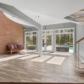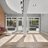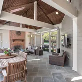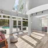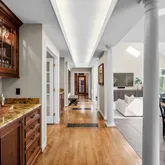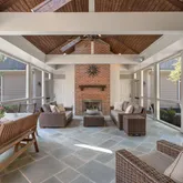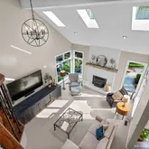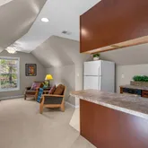 A breezeway adorned with an inviting fireplace and soaring cathedral ceilings connects the main house to a private guest apartment—perfect for long-term guests, multigenerational living, or au pair quarters. The apartment includes its own bedroom, kitchen, and living room for complete independence and comfort.