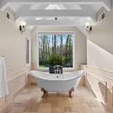 The upper level boasts a luxurious primary en suite offering his and her dressing areas, a spa-inspired frameless glass shower, and a freestanding clawfoot soaking tub—the ultimate space to unwind. The additional bedrooms are generously sized and each feature organizational system by California Closets.