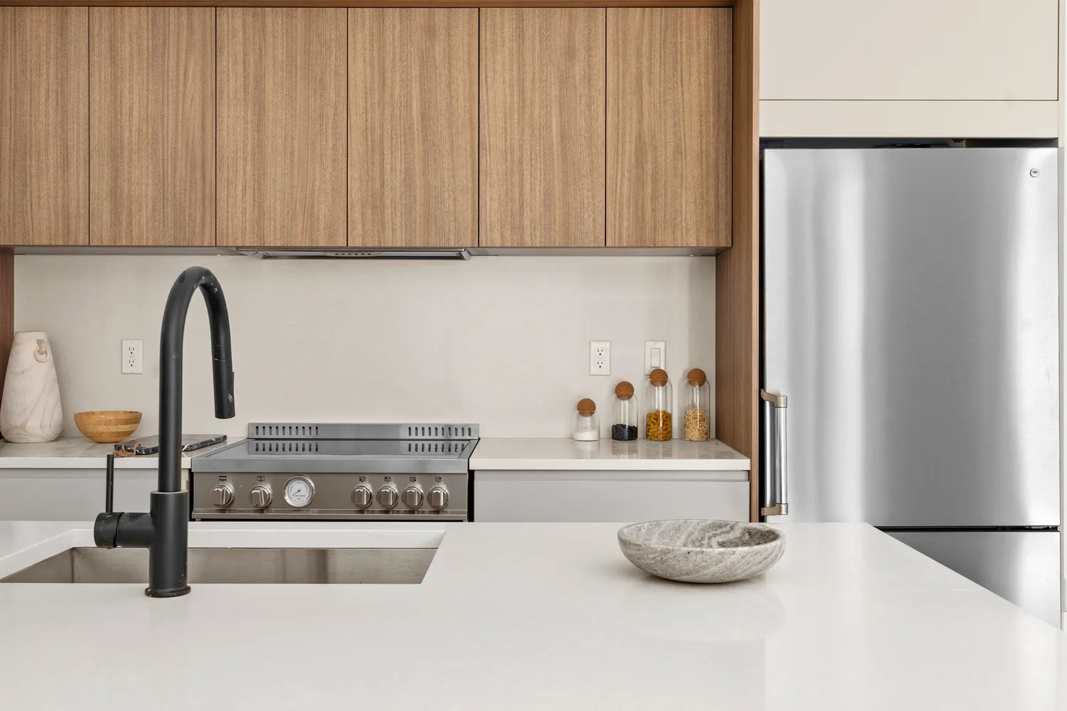 Crafted for culinary excellence, our Italian kitchens at The Destination feature sleek Sahara-colored lacquered cabinets with a matte finish. Base units boast grooves, while top cabinets offer a seamless "push to open" system. Illuminated by under-cabinet LED lighting, the Perla white countertop and backsplash create a pristine, modern workspace. The circular single-handle pull-down kitchen faucet in black adds a touch of sophistication, making every meal preparation an elegant experience.