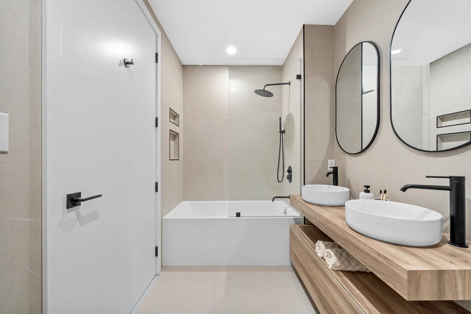 Experience everyday luxury in our exquisitely designed bathrooms. Adorned with ivory matte porcelain, the bathrooms feature apron bathtubs and sleek LUCHENA BATH vanities with Quarzo vessel sinks. Indulge in the Opera shower system with a black matte finish, offering both wall-mounted and hand-held options. The bathroom adds extra elegance with a 24" Niagara vanity and white vessel sink. Every detail ensures a harmonious blend of style and comfort.