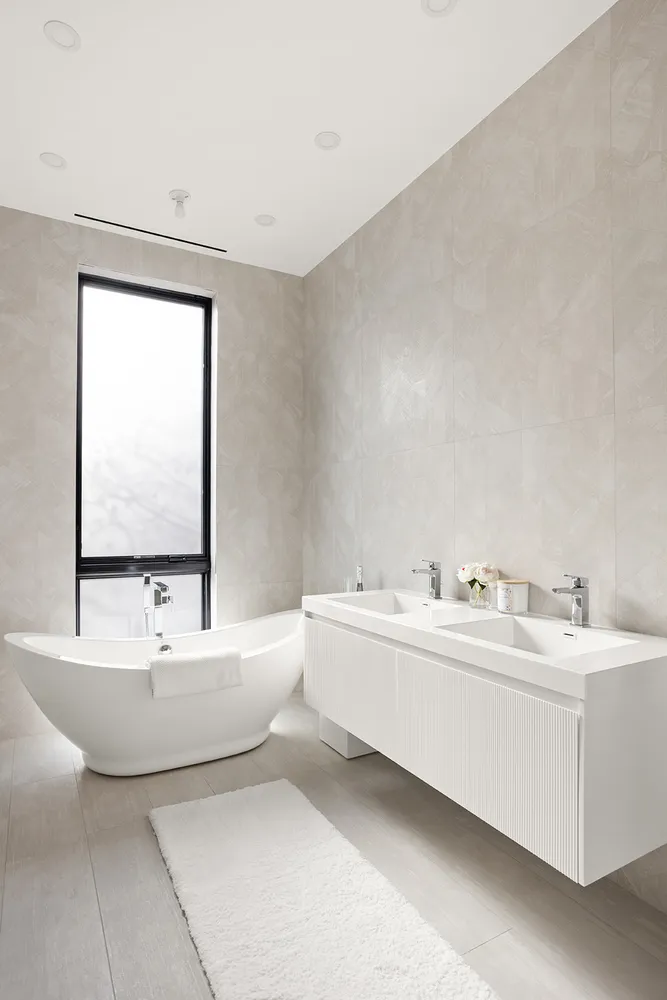 The crown jewel of the property is the triplex penthouse spanning the third, fourth floors & private roof deck. The lower level features three spacious bedrooms, including a primary suite that exudes luxury with its custom walk-in closet and a spa-inspired bathroom. The bathroom is a sanctuary, complete with an oversized double-sink vanity, heated floors, a soaking tub framed by a full-length window with treetop views, and high-end finishes throughout.