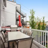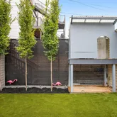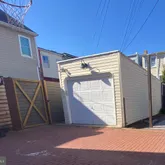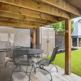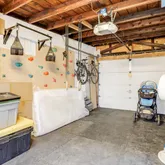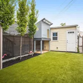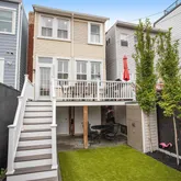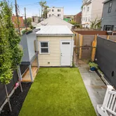 Large separate living room with exposed brick, custom wood shutters and a coffered ceiling with medallion opens onto the bright dining area. A long storage peninsula connects to a kitchen outfitted with stainless steel appliances and quartz counters, making dinner parties large or small a breeze. Both open onto a large flexi-use sunroom at rear with custom wood shutters. Step onto the spacious Trex deck for easy al fresco dining and grilling with friends, overlooking the evergreen turf, an adorable treehouse with built-in sandbox below (as is), and storage garage with an automatic opener and alley access. Garage has a mini-gym setup that conveys (padded flooring, bench and squat rack), and offers massive storage space for cargo bikes, strollers, and motorcycles.