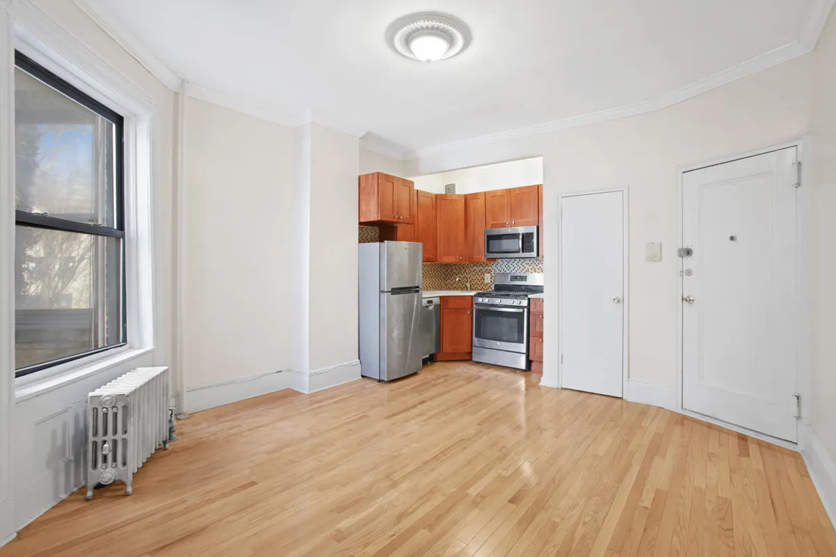 Apartment #3B sits on the third floor of an extra wide rental building with a fenced-in front area. One end of the apartment is a kitchen and living/dining area, which is connected by a short hallway to a spacious bedroom that gets plenty of natural light. The place has plenty of flexibility and space to make it your own. There is no laundry in the building, but there is a laundromat a block away, as well as several pickup/delivery services that work in the area.