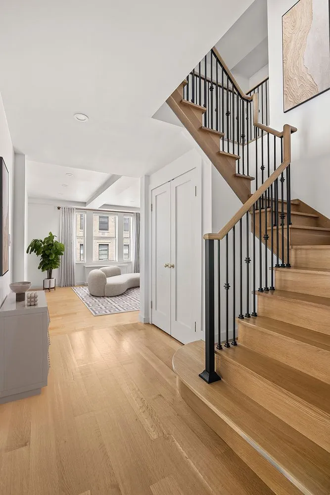 Upon entering, you'll be immediately captivated by the seamless blend of modern design and timeless aesthetics as you pass through the foyer to an elegant cascading staircase. The living space is full of natural light with loft-like proportions that make this the perfect space for relaxing or entertaining. The living space leads into a fully outfitted mudroom with a separate entrance and plenty of storage. The mudroom is connected to your very own laundry room – a rarity in New York City. This deluxe laundry room features an LG washer and steam dryer, two sinks, a Kraus oversized sink and Neptune jetted sink for your delicates, drying space with fan, a wall-length “art-room” counter with stools, and ample storage in high-end cabinetry. Down the hallway you will find your sixth bedroom, den, or television room with built in bookcases and Eastern city views.