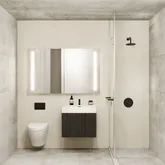 The bathrooms are fully outfitted with Porcelanosa tile and fixtures that include a wooden floating vanity, hidden ballast toilet, rainshower and matte black fixtures. They are fully encased in textured, non-slip Porcelanosa tile for a cohesive and elegant aesthetic.