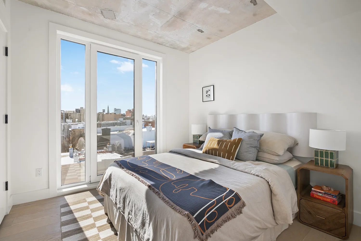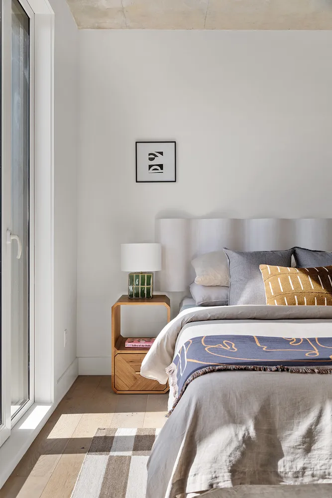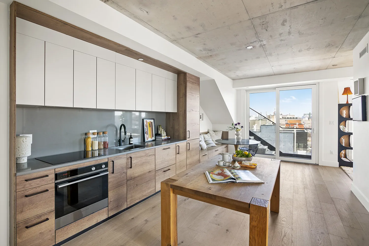 The floors are European white oak wide-plank wood and the ceilings are exposed concrete. The kitchen features custom millwork, plus Fisher Paykel appliances with matching panels for a seamless look. Tile work and fixtures by Porcelanosa. Stain and heat-resistant quartz countertops complete the high-end design.