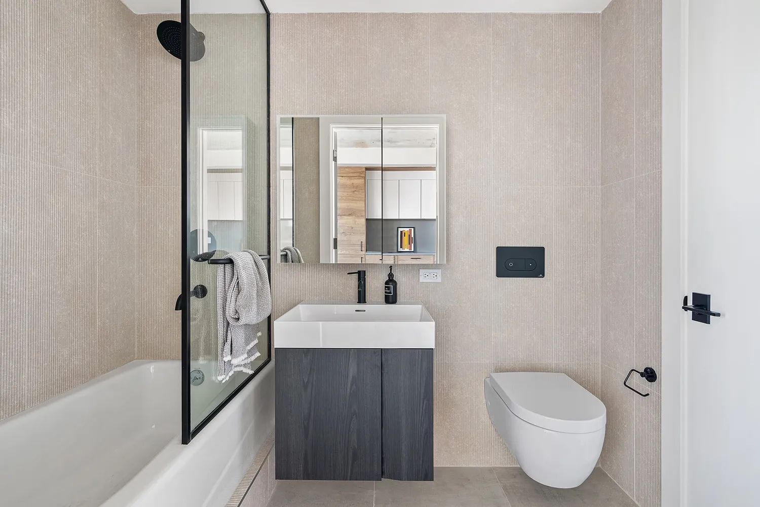 The bathrooms are fully outfitted with Porcelanosa tile and fixtures that include a wooden floating vanity, hidden ballast toilet, rainshower and matte black fixtures. They are fully encased in textured, non-slip Porcelanosa tile for a cohesive and elegant aesthetic.
