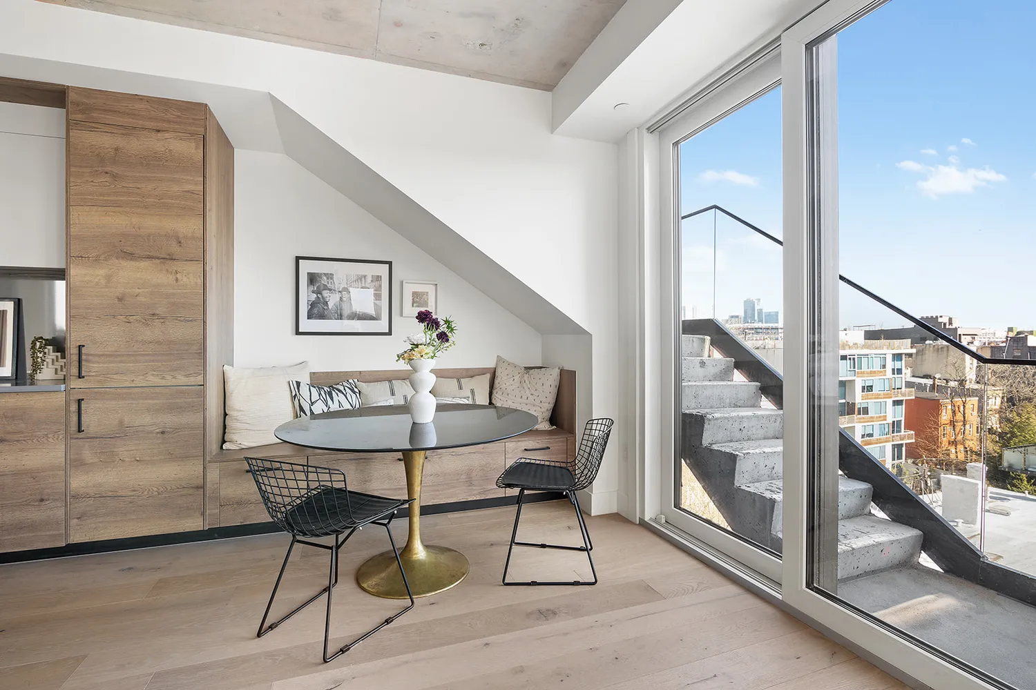 This one bed, one bath unit offers a thoughtful and elegant layout while also providing unparalleled, private outdoor living. The living space has multi-use flexibility and can function well as a home office with its triple exposure, floor-to-ceiling windows. Directly off of the dining area is a private staircase that leads to your own 577 sq ft roof terrace. This space is a true retreat away from it all. A perfect space to entertain or a serene sanctuary where you can take in the 300 degree City and Brooklyn views.