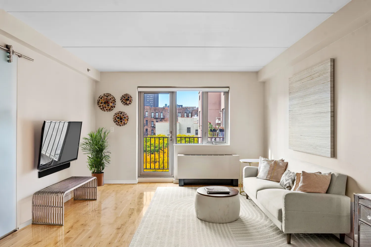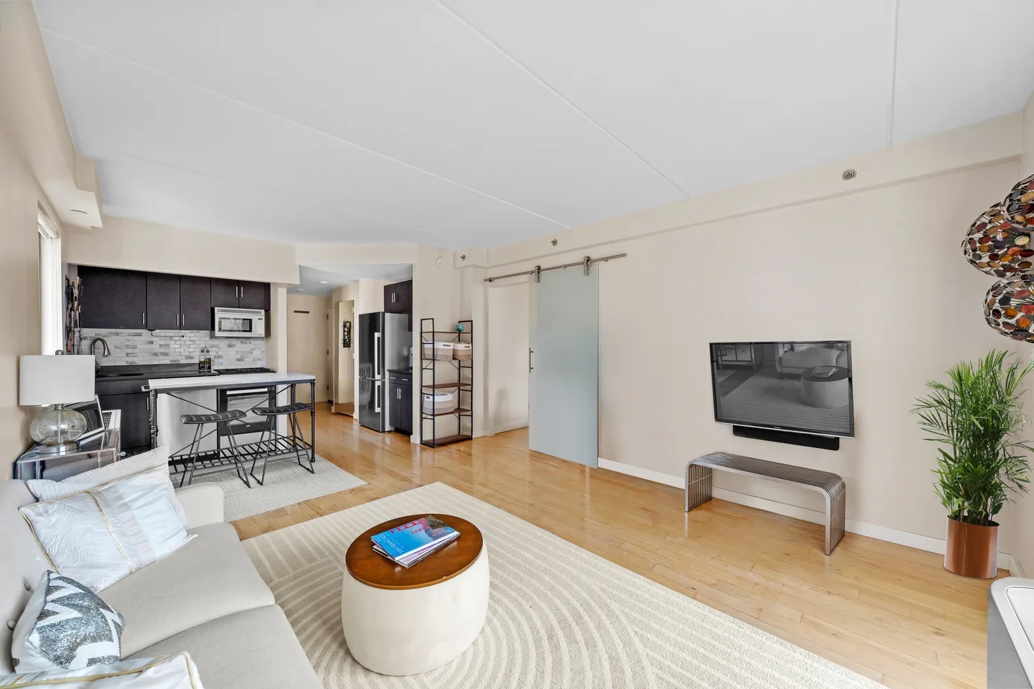 Upon entry, you're greeted by a welcoming foyer leading into an open-concept kitchen, fully outfitted with high-end stainless steel appliances. The adjoining living room, bathed in light from the West, opens onto a private balcony with sweeping views and stunning sunsets. The bedroom offers custom-built architectural storage and closets, which not only provide ample storage but are visually striking. Additional highlights of the home include elegant frosted glass barn doors, light hardwood floors, high ceilings, and central air conditioning—thoughtfully designed to elevate comfort and style.