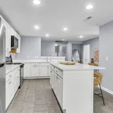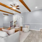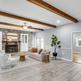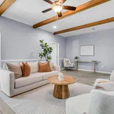 Then there's the living areaa cozy, welcoming space centered around the original red-brick fireplace, framed by built-ins that are both stylish and functional. The exposed beam ceiling and sleek tile flooring tie everything together, making it the perfect spot to gather for movie nights or holiday celebrations.