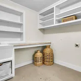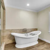 The primary suite offers privacy as a retreat at the back of the house, with a freestanding tub that beckons you to unwind, an oversized tiled shower, and a designer walk-in closet with custom shelving.
