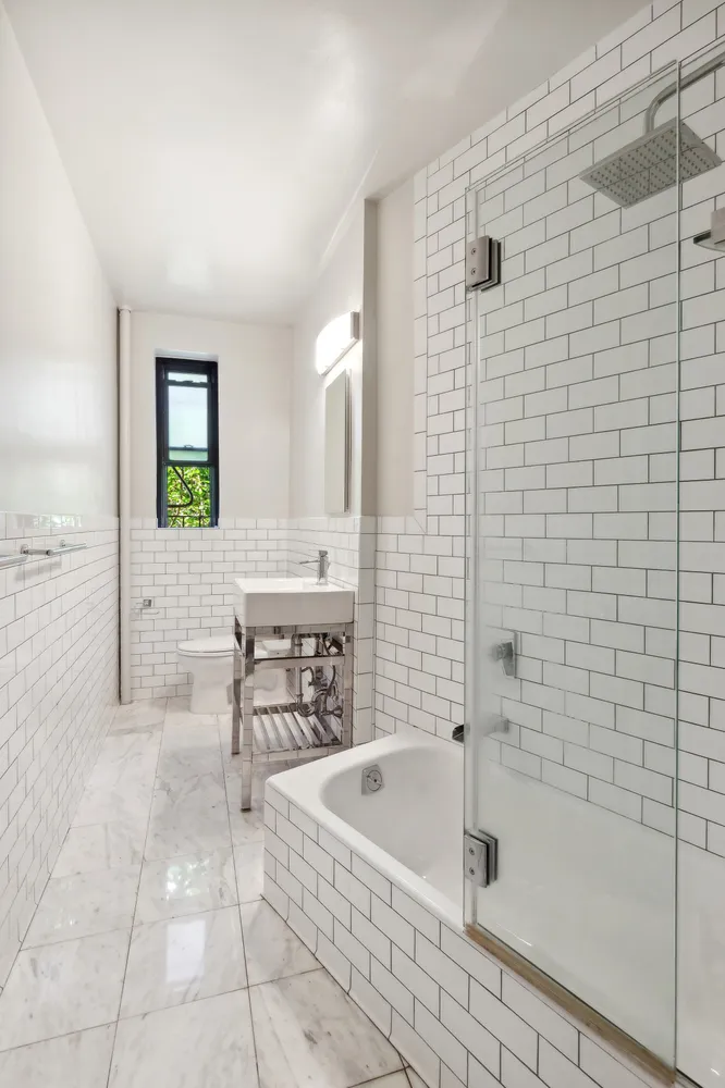 Even the bathroom is especially large and fully renovated with a deep Kohler cast-iron soaking tub, Riobel shower system, custom glass doors, wall subway tile, Toto toilet and polished Bianco Cararra marble floor.