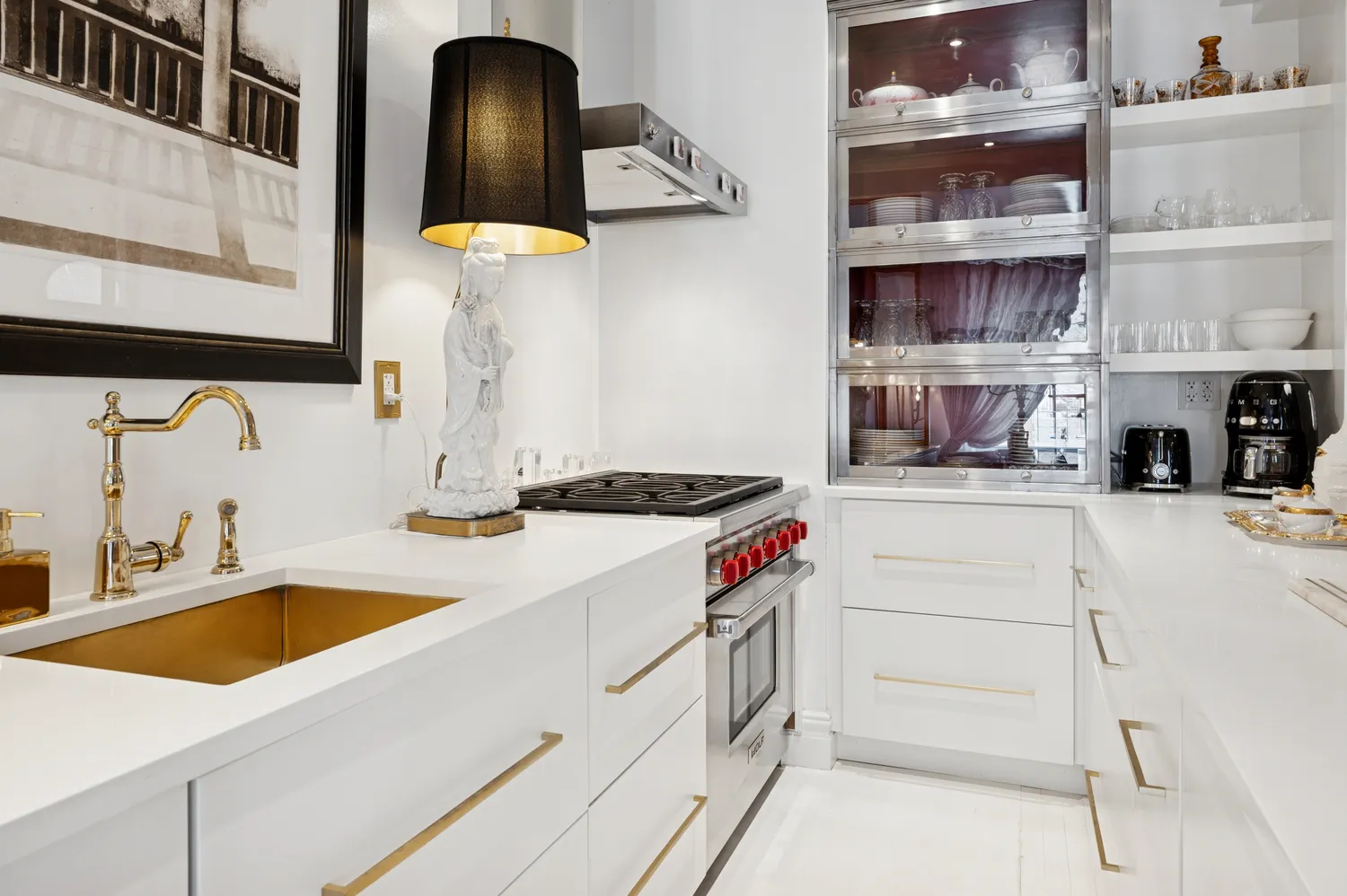 The stunning kitchen had been transformed into a chef’s dream with top of the line appliances from Wolff, Subzero and Miele, custom cabinetry, a solid brass sink and quartz counters. A wall of framed glass creates a seamless flow between the kitchen, living room and dining areas.