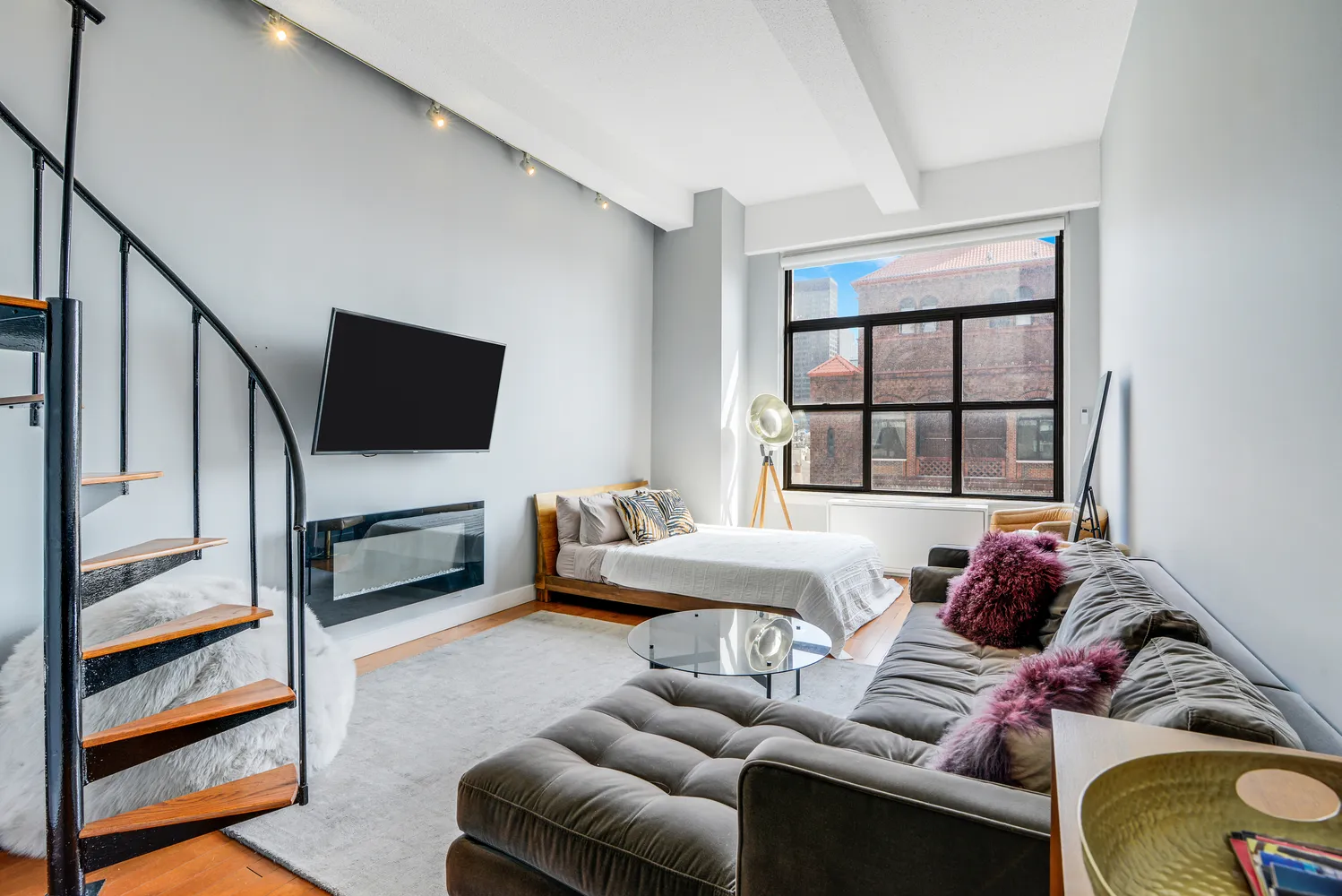 Enjoy high-floor luxury living at 244 Madison Avenue, an elegant prewar coop in midtown Manhattan! This stylishly-designed studio apartment with a loft bedroom has open east-facing views that will take your breath away. Soaring 11'9" beamed ceilings, beautiful hardwood floors, a huge picture window and new modern finishes complement the airy living space. The renovated kitchen boasts a new sleek countertop and new stainless steel appliances. A graceful spiral staircase...FURNISHED RENTAL AVAILABLE 5/1.