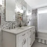 Upstairs, you are met with a large landing space, and four large bedrooms! Shared hall bathroom has been renovated with high end textured tile flooring, imported custom shower tiles and custom cut outs, custom high-end vanity with square sink and quartz counter top. The primary bedroom ensuite has vaulted ceilings, a wonderful closet, and another custom renovated bathroom to include: tiled walls throughout, a custom flush medicine cabinet, granite countertop with custom high-end vanity and custom finishes. Exhaust fan is also custom to create a quiet clean experience. Every detail has been thoughtfully done.