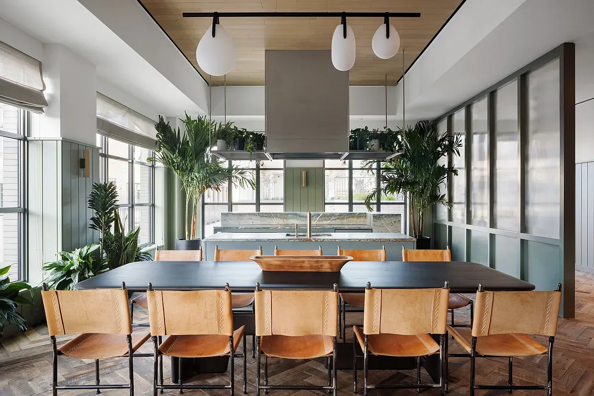 The open living/dining area is highlighted by chevron-patterned white oak floors and chef's kitchen appointed with Caldia marble countertops and backsplash, custom-designed Italian white oak cabinetry, and a suite of Gaggeneau appliances (5-burner stove, stainless-steel hood, under-counter oven, dishwasher, paneled refrigerator/freezer and stainless steel built-in microwave).