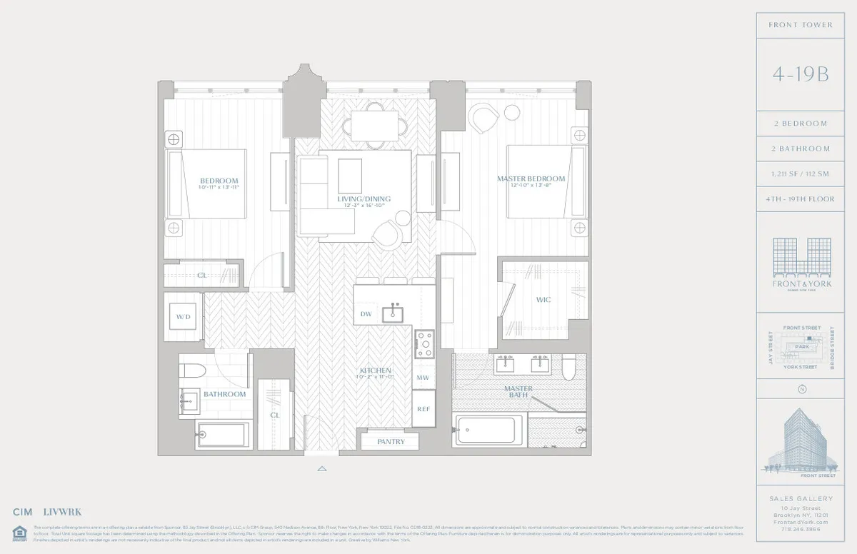The open living/dining area is highlighted by chevron-patterned white oak floors and chef's kitchen appointed with Caldia marble countertops and backsplash, custom-designed Italian white oak cabinetry, and a suite of Gaggeneau appliances (5-burner stove, stainless-steel...Ultra luxury, impeccably designed 1200+ sq ft 2BD 2BA punctuated by spectacular views of the Manhattan skyline, bridges and East River throughout and located in Dumbo's premiere, full-service condominium with unrivaled amenities.