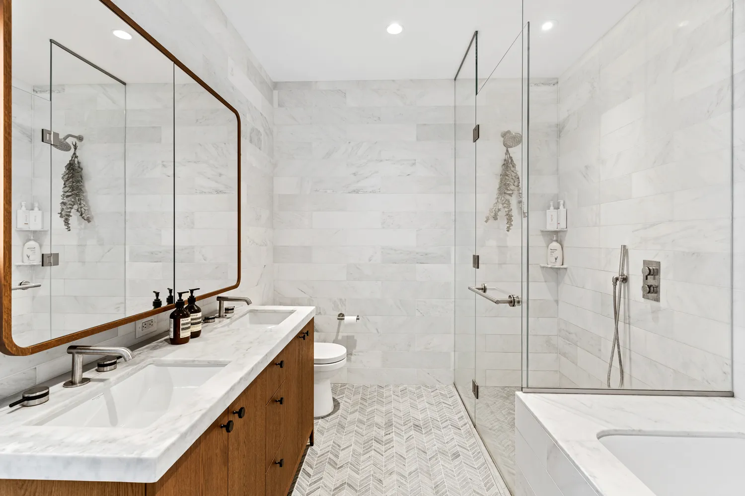 The sprawling en-suite primary suite has a huge walk-in closet and a dual sink bathroom featuring custom designed Italian vanities, striking white Bianco Bello marble walls and radiant heated marble floors.
