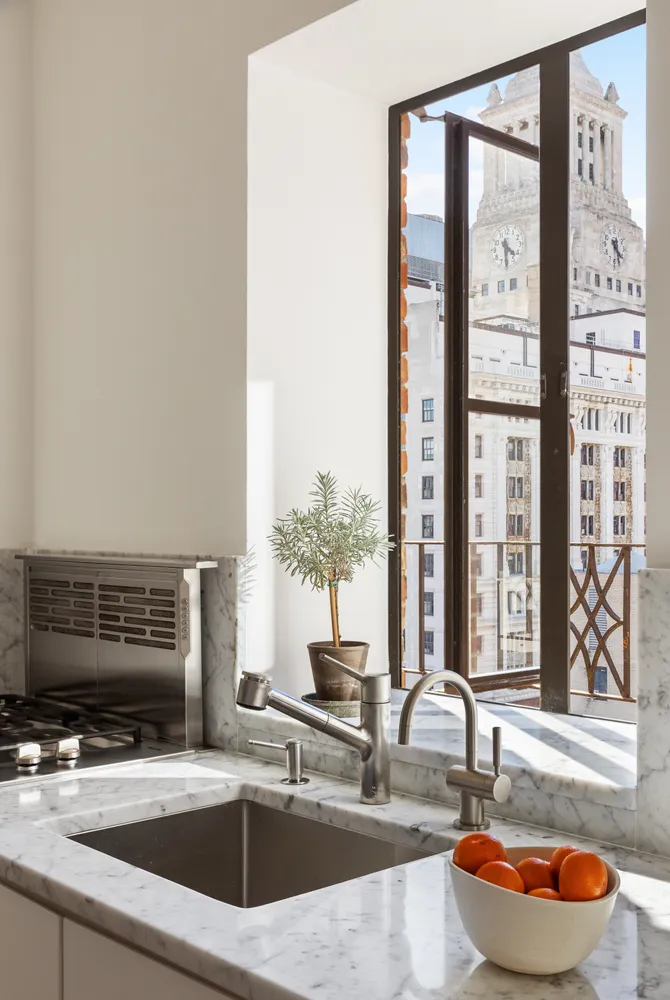 The elegantly designed kitchen features marble countertops, a Sub-Zero refrigerator, and high-end Miele appliances, including a stove, oven, and dishwasher. The...Luxury Penthouse Studio with Expansive Private Terrace – 200 E 16th St, PHC