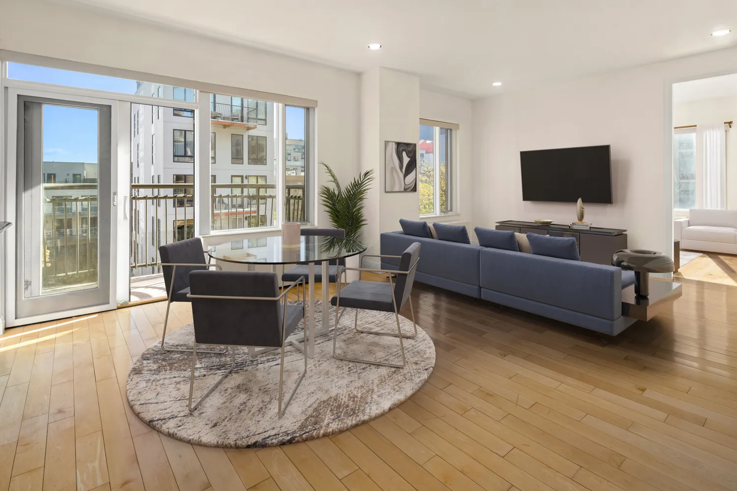 The spacious living area offers ample room for both a dining and living setup. Additional highlights include a powder room, coat closet, sound proofed windows, recessed lighting and 2 wall-unit AC's.