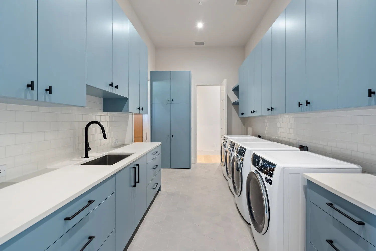 On the other side of the home are two bedrooms with ensuite baths, a large utility room with dual washers and dryers, a three-car garage, and a separate one-car garage.