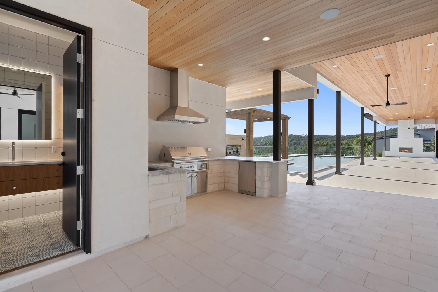 The property includes a private casita by the pool, featuring a living area, kitchenette, and full bath. The expansive pool area features a dedicated pool bath and outdoor summer kitchen, in addition to a sunken conversation area overlooking the spa and resort-sized pool.