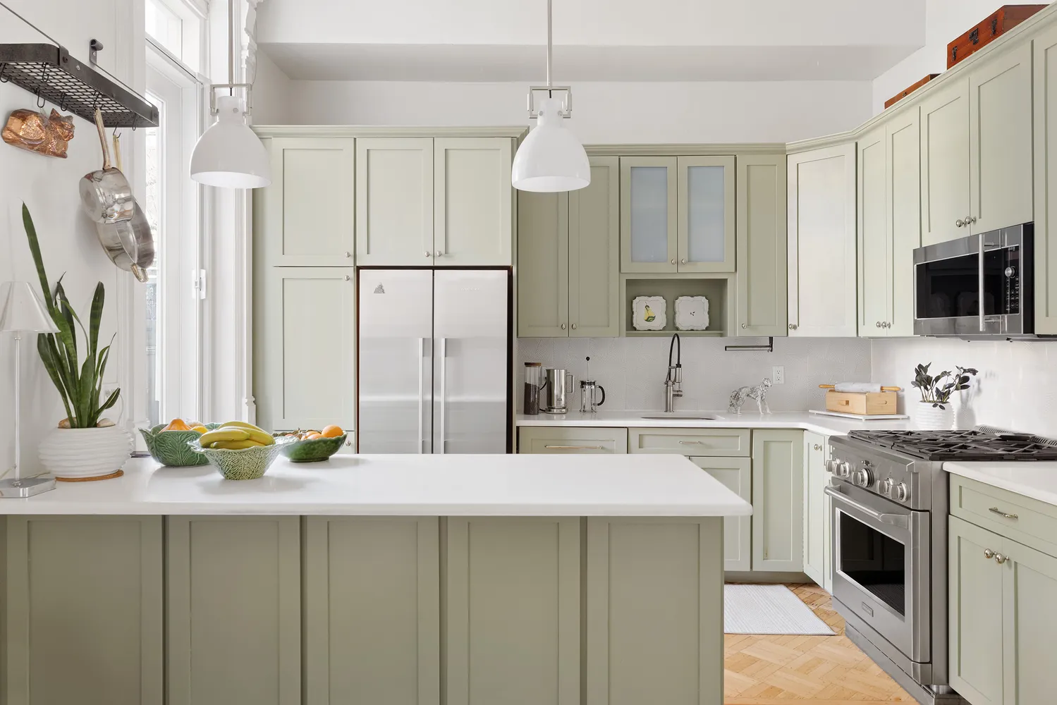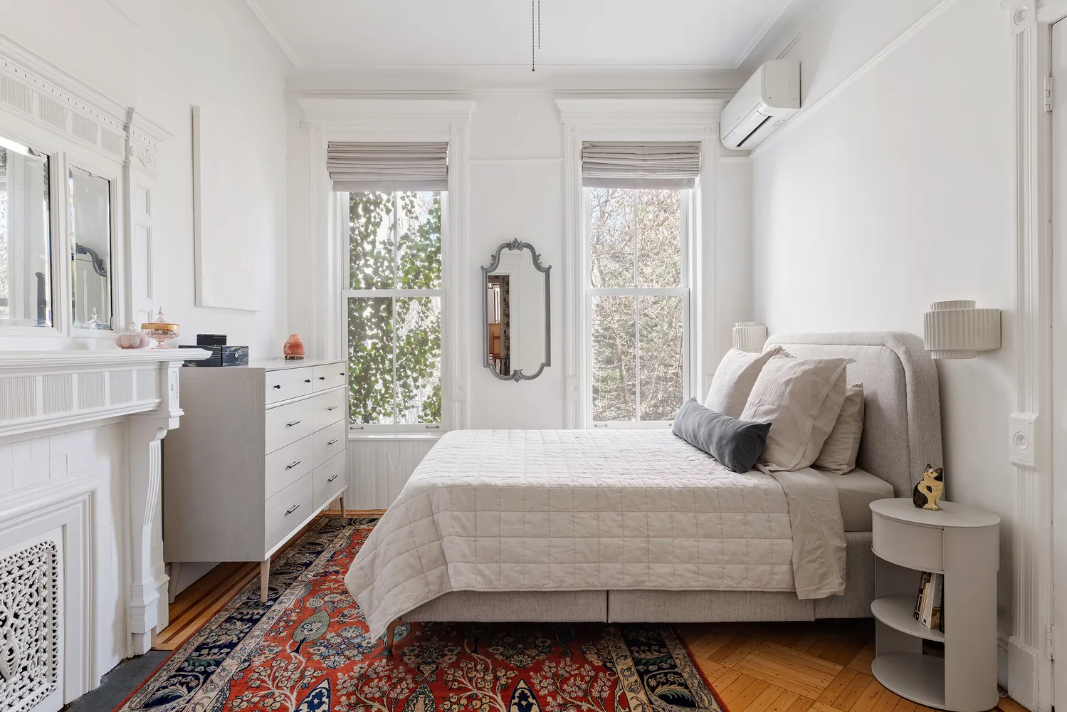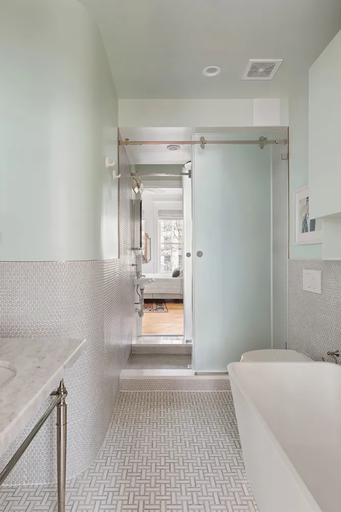 On the parlor level you'll be swept away by soaring 11-foot ceilings, sunlit grandeur, and a level of craftsmanship that’s hard to come by. Think original hardwood floors, beautifully restored woodwork, intricate plaster moldings, ornate fireplaces, rich mantles, and pocket doors that whisper stories from another era. And the kitchen? A chef’s dream with its sleek architectural design, crisp white stone counters, classic tiled backsplash, abundant cabinetry, built-in wine rack, and a full suite of stainless steel appliances including Bosch, Monogram, and Fisher & Paykel.
