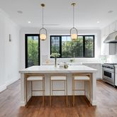 Gorgeous wide-plank floors, towering ceilings, oversized windows and designer lighting make a glorious first impression in the three-bedroom, two-and-a-half-bathroom owner's unit. Relax in front of leafy views and a stunning wood-burning fireplace in the living room while the adjacent dining area sets the stage for lively dinner parties. The rear-facing kitchen is ready to serve gatherings both large and small thanks to its custom cabinetry, Caesarstone countertops, marble tile backsplashes and fantastic Viking appliances, including a gas range with pot filler, French door refrigerator and dishwasher. Enjoy casual meals under beautiful pendant lighting at the center/island breakfast bar, or take advantage of the spacious deck and yard for outdoor dining.