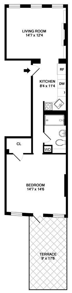The sizable living room can also easily accommodate dining. With south facing windows looking onto Downing Street, the living area is flooded with natural light. Other living room features include marble decorative fireplace, crown molding throughout, and hardwood floors. The bedroom can easily accommodate a king-sized bed and includes a massive walk-in closet and additional second closet. The renovated bathroom has a stall-shower and houses the washer/dryer. Off the bedroom you have the crown jewel, your very own expansive private terrace.