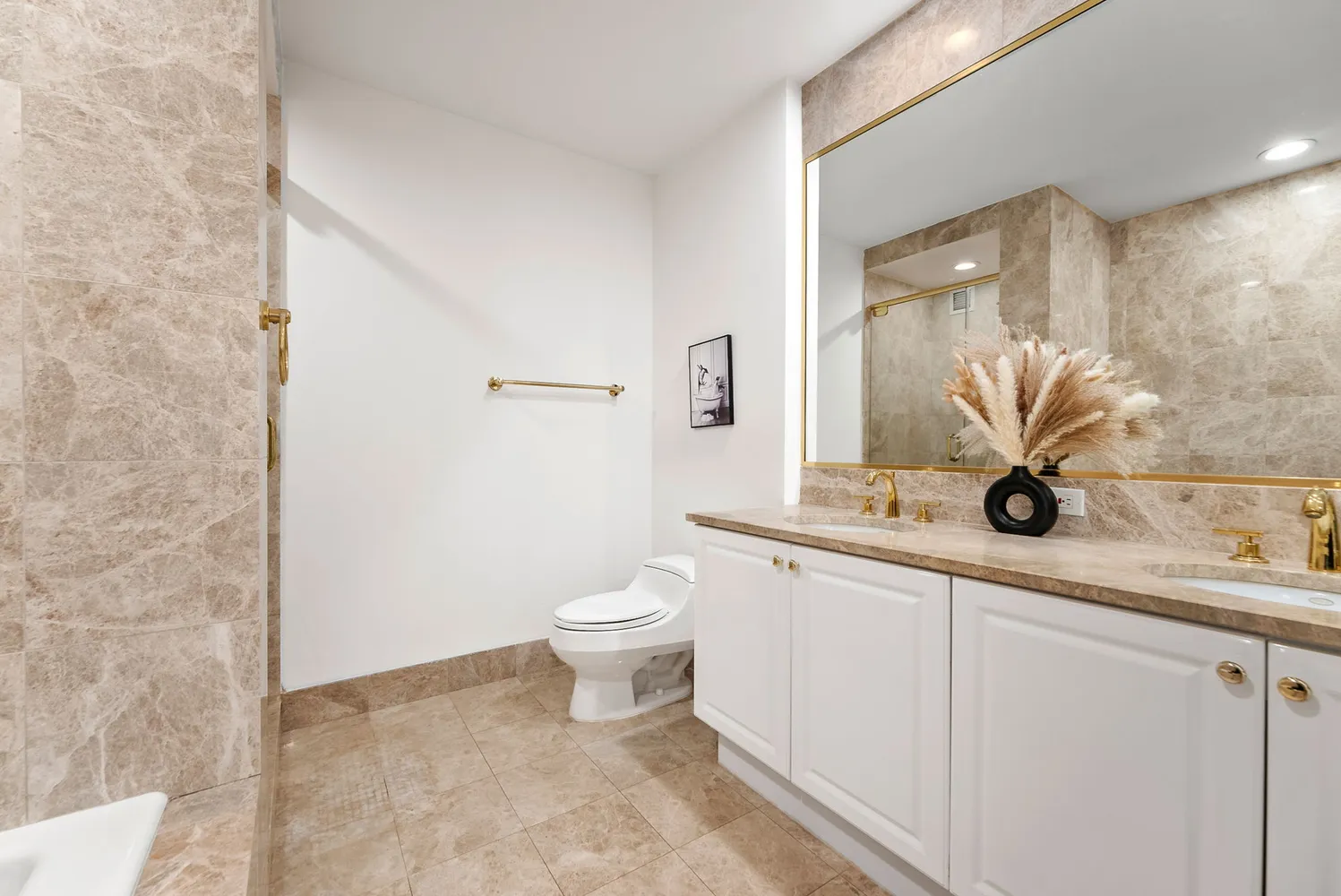 The primary bedroom suite has an en-suite five fixture marble bathroom including a ceramic soaking tub, a separate glass-enclosed shower, and a double vanity, and standing shower and double vanity sink and plus a huge 6x7 custom walk-in closet. The second bedroom is across the hall from a second full bathroom. It can be used as a home office or fit up to a queen size bed.