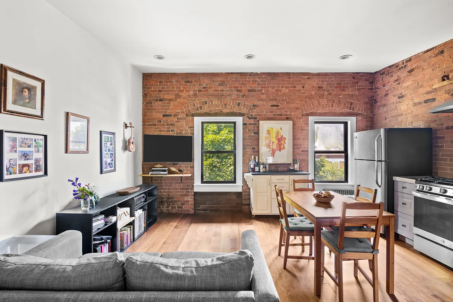 With northern exposure, a spacious entry foyer and inviting flow, this warm home welcomes its next owner with an open kitchen featuring handsome gray cabinetry complemented by poured concrete countertops and a hexagon mosaic tile backsplash, open shelving and full-sized appliances by GE, whirlpool & Frigidaire. The tastefully finished bathroom has a subway tile with a green glass accent, dark wood vanity and cork floors. Relax in a bright and spacious bedroom where one can comfortably fit a queen bed with additional furnishings.