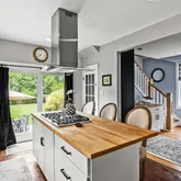 The kitchen is a true centerpiece—stained concrete floors, soapstone countertops, and a butcher block island set the stage for everything from morning coffee to lively gatherings. High-end stainless steel appliances, a double farmhouse sink, and a walk-in pantry with custom shelving (plus extra counter space for a coffee bar or home office) make this space as functional as it is beautiful. A first-floor bedroom and full bath offer flexibility for guests or a home office.