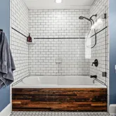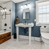 Upstairs, three spacious bedrooms feature custom closets, while a newly renovated hallway laundry area adds convenience. The large bathroom is a retreat of its own, complete with an extra-deep soaking tub and sleek hinged glass door.