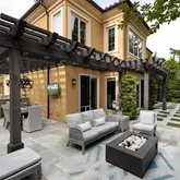 custom lighting, outdoor speakers, and built-in heaters. The yard includes 24” quartzite natural